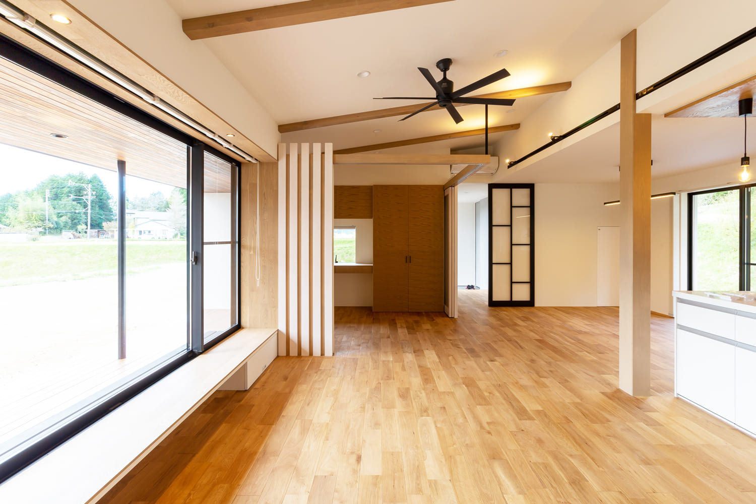 空間を、まるで優しいヴェールのように軽やかに仕切りながらも、大切な視線が、心地よく、そして自然に抜けることで、空間全体に、さらなる広がりを感じさせる、美しい黒枠の上質なガラス戸。