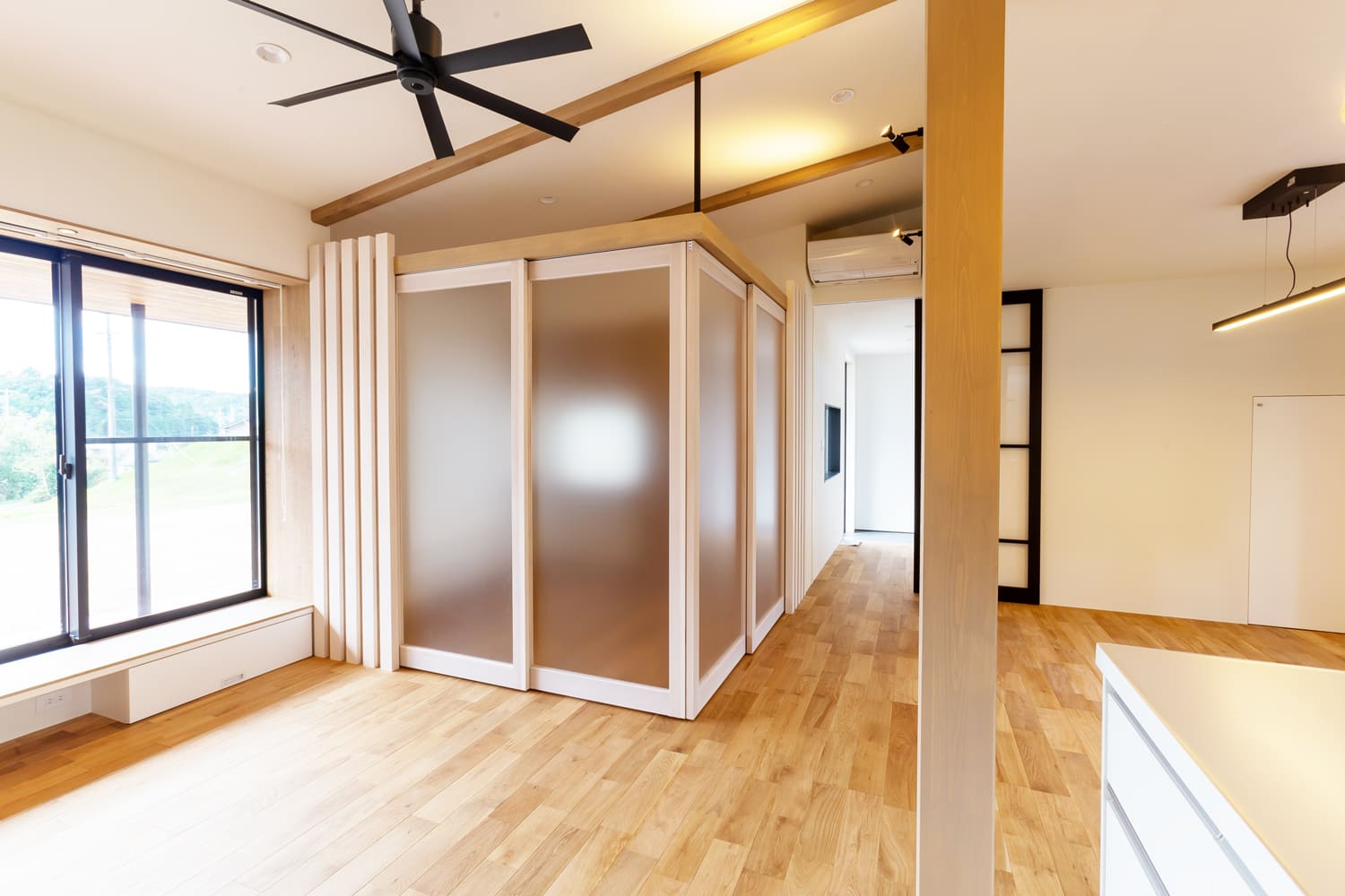 美しい間仕切りは、優しい光を程よく、そして効果的に通すため、たとえ閉め切ったとしても、圧迫感を一切感じさせず、空間全体が、柔らかな、そして心地よい明るさを、常に保ちます。
