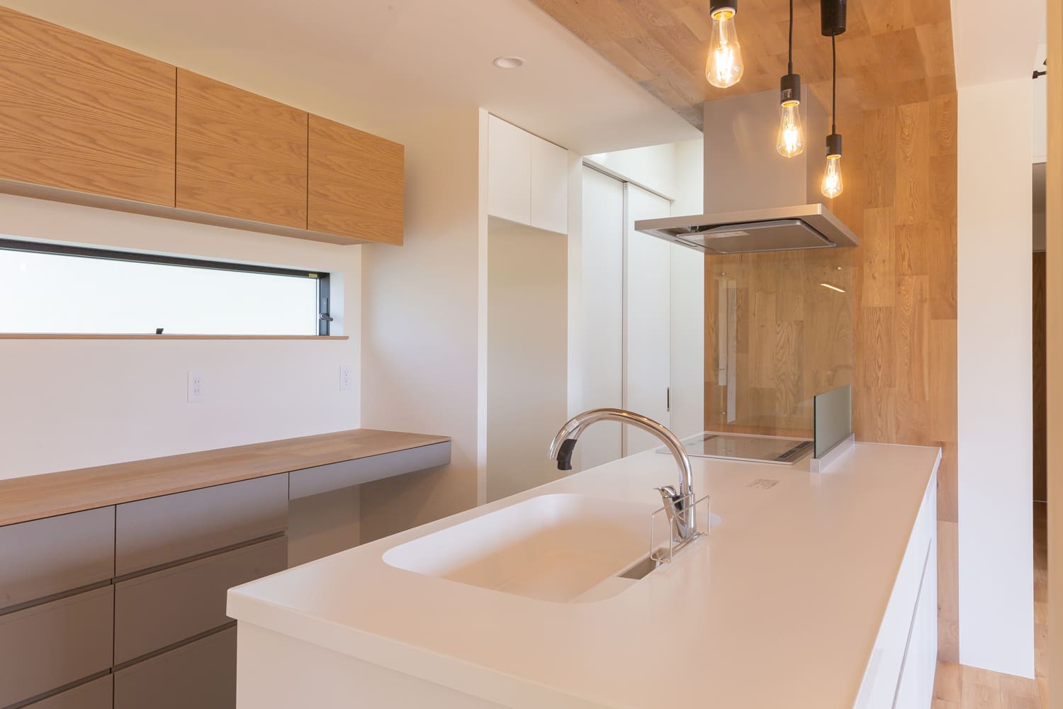 そして、壁に効果的に設けられた横長の窓からは、朝の清々しい、柔らかな自然光がたっぷりと差し込み、キッチン全体を、どこまでも明るく、そして心地よく照らしてくれることでしょう。