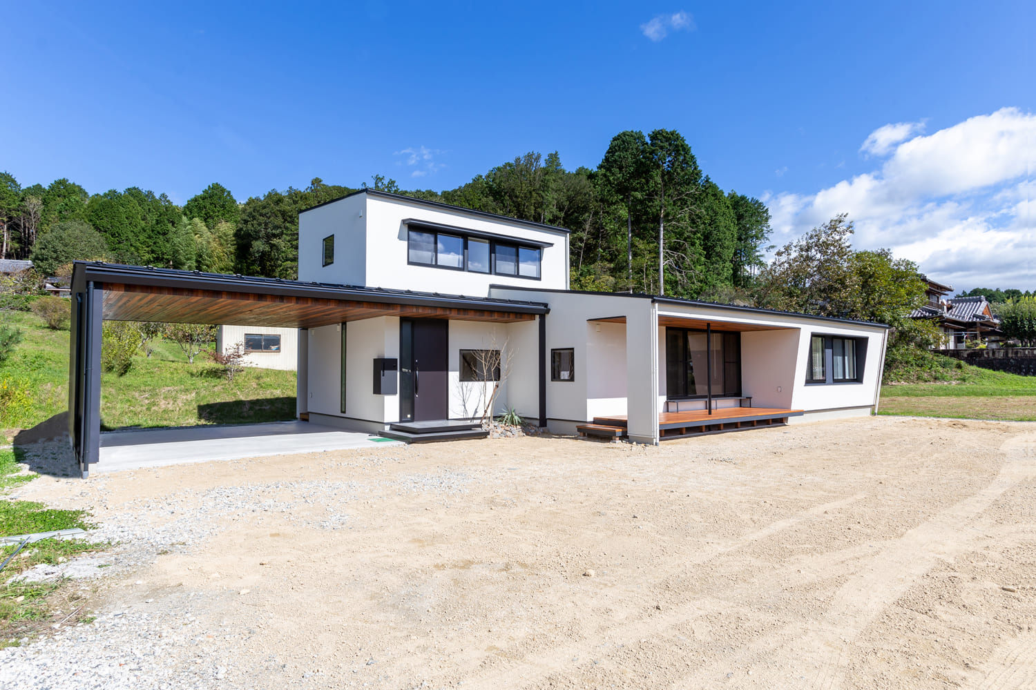 清らかで美しい白を基調とした、どこまでもシャープで知的なフォルムに、肌で感じる木の温もりと、空間全体を引き締める効果を持つ、上質なブラックのアクセントが、まるで美しい旋律のように絶妙に効いた、息をのむほど美しい外観は、洗練されたモダンデザインの、揺るぎない真髄を、私たちに見せつけているかのようです。