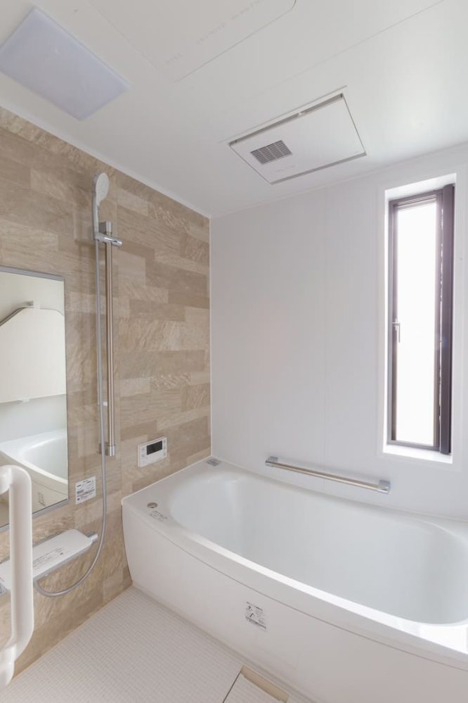 壁一面に施された、柔らかな、そして心安らぐベージュトーンの美しいアクセントパネルが、まるで、世界的に有名な高級ホテルの、洗練されたスイートルームのバスルームのような、深い落ち着きと、肌で感じる温もりを、品格と共に静かに醸し出す、この特別なバスルーム。